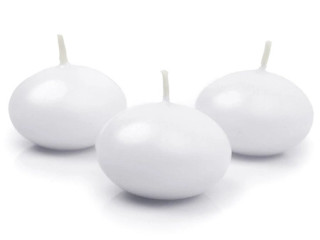 - Świeca pływająca Dysk, matowa, w kolorze białym, rozmiar 5 centymetrów. Czas palenia 1 sztuki około 3 godzin. (1 op. / 10 szt.)