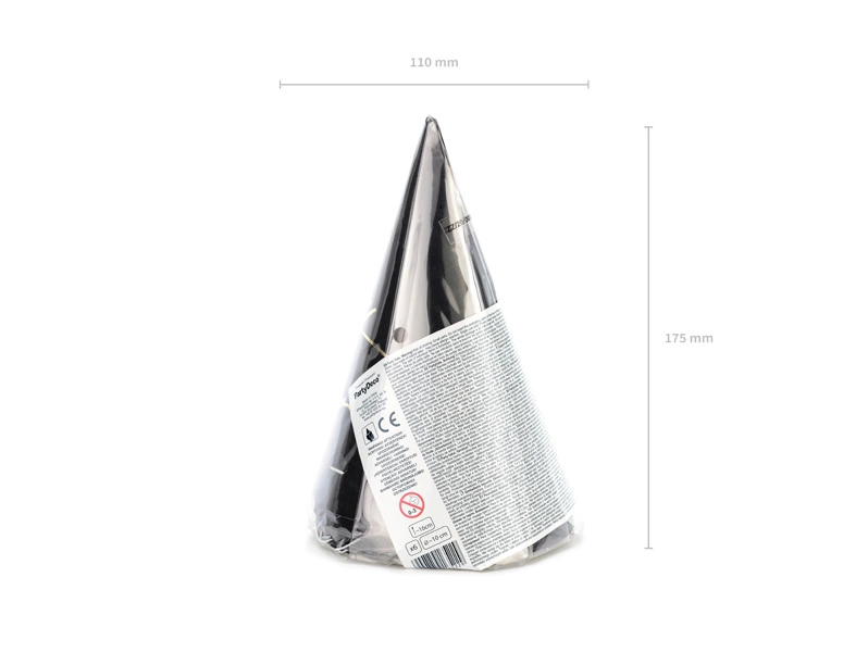 - Czapeczki Happy New Year wykonane z papieru w kolorze czarnym ze złotym metalizowanym nadrukiem, mix wzorów. Wysokość ok. 16 cm, średnica ok. 10 cm. (1 op. / 6 szt.)