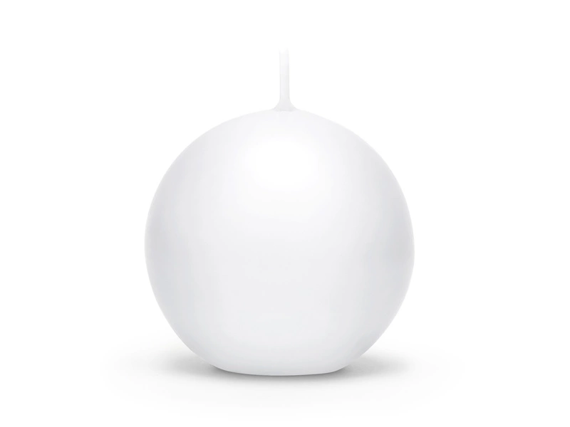 - Świeca matowa Kula w kolorze białym, średnica 6 centymetrów. Czas palenia 1 sztuki około 8 godzin. (1 op. / 10 szt.)