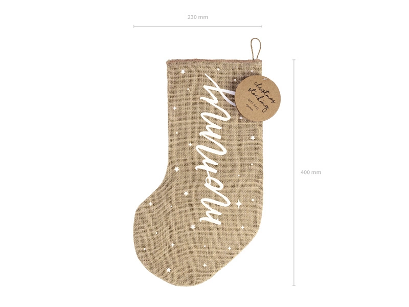 Wprowadź odrobinę świątecznej magii do swojego domu dzięki skarpecie dekoracyjnej Mommy. Ta elegancka skarpeta, wykonana z naturalnej juty i ozdobiona białym nadrukiem z napisem "Mommy", ma wymiary 23 x 39.5 cm, co czyni ją idealnym dodatkiem do Twojego bożonarodzeniowego wystroju.