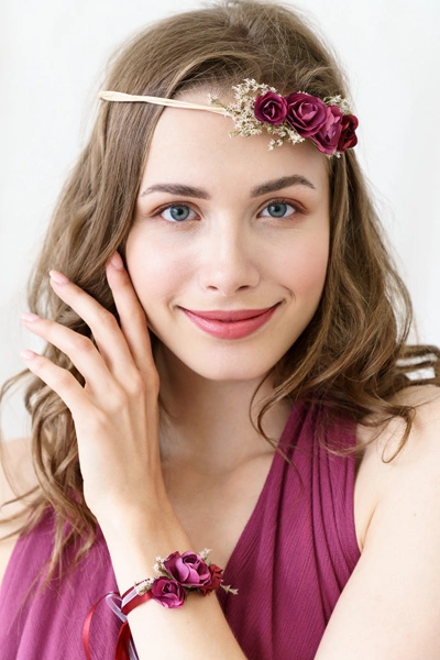 Nie czekaj! Dodaj nasz bordowy wianek z kwiatami do swojej kolekcji i spraw, aby każda okazja była wyjątkowa. Ten elegancki i wszechstronny dodatek z pewnością przyciągnie uwagę i doda magii Twoim wydarzeniom!