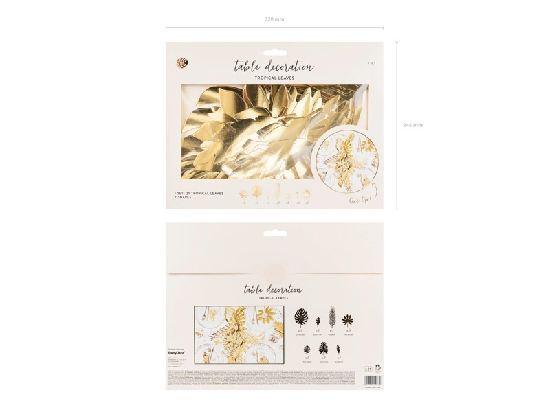 - Dekoracje papierowe Aloha - Liście tropikalne w kolorze metalizowanym złotym, zestaw zawiera 7 kształtów (po 3 szt. z każdego). (1 op. / 21 szt.)
