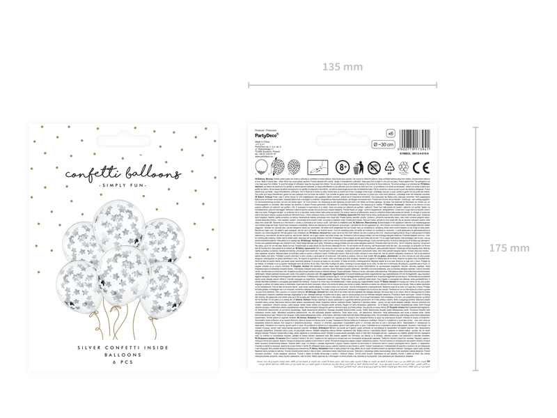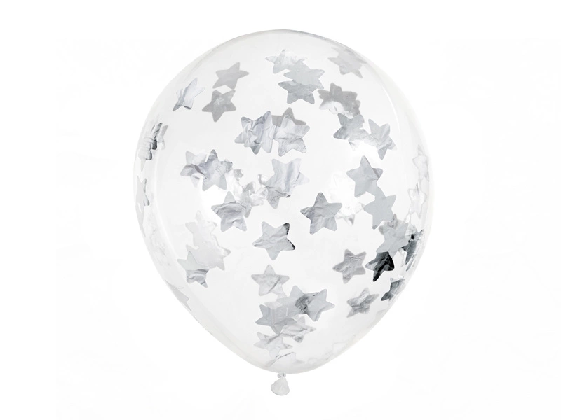 - Transparentne balony ze srebrnym metalizowanym konfetti w kształcie gwiazdek w środku, średnica balonu ok. 30 cm. (1 op. / 6 szt.)