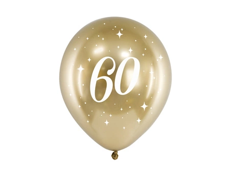 Kolor: Złoty z białym nadrukiem "60" Rozmiar: Średnica 30 cm Materiał: Lateks