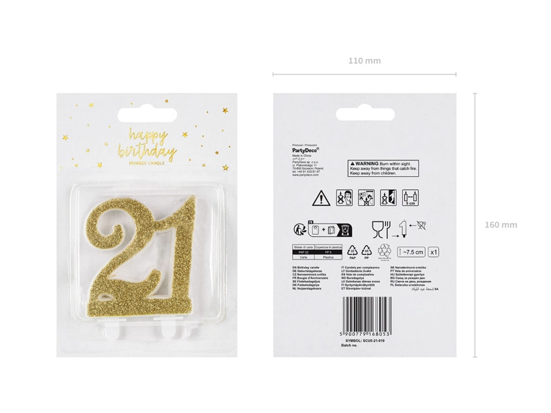 - Świeczka urodzinowa liczba 21 w kolorze złotym brokatowym, rozmiar ok. 7.5 cm.