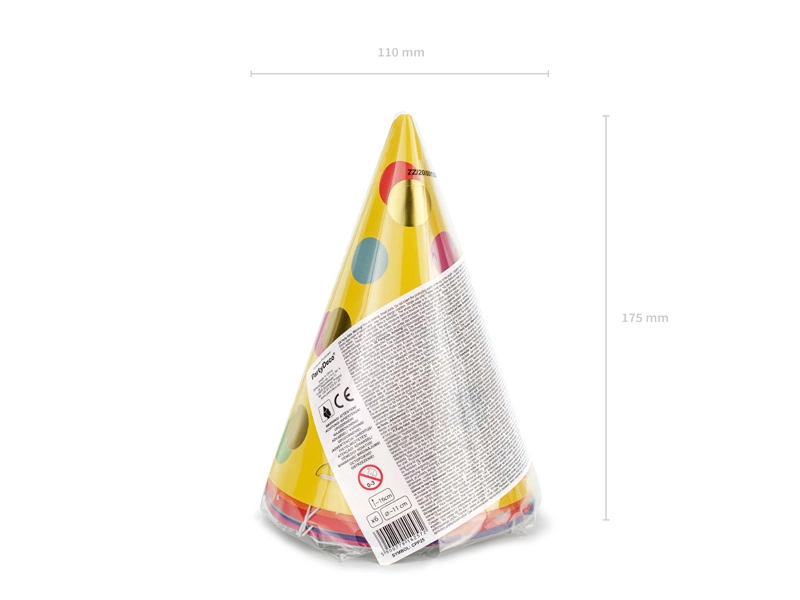 - Czapeczki w 6 kolorach z kolorowymi i złotymi kropkami, wysokość ok. 16 cm, średnica ok. 11 cm. (1 op. / 6 szt.)