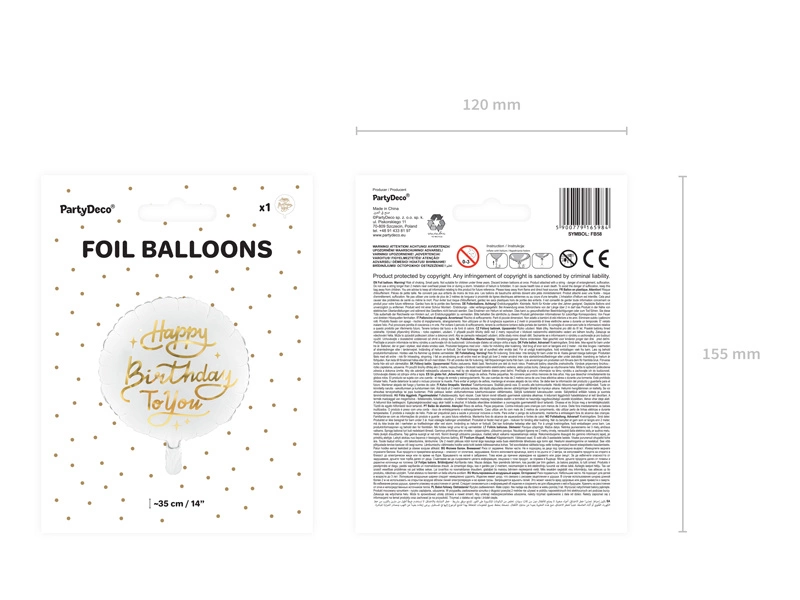 - Matowy balon foliowy w kolorze białym ze zlotym metalizowanym napisem Happy Birthday To You, średnica przed napompowaniem ok. 45 cm (18''), średnica po napompowaniu ok. 35 cm (14''). Do napompowania helem.