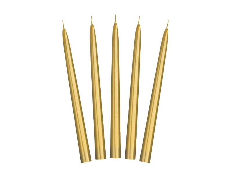 - Świeca stożkowa metalizowana w kolorze złotym, wysokość 24 centymetry. Czas palenia 1 sztuki około 5 godzin. (1 op. / 10 szt.)