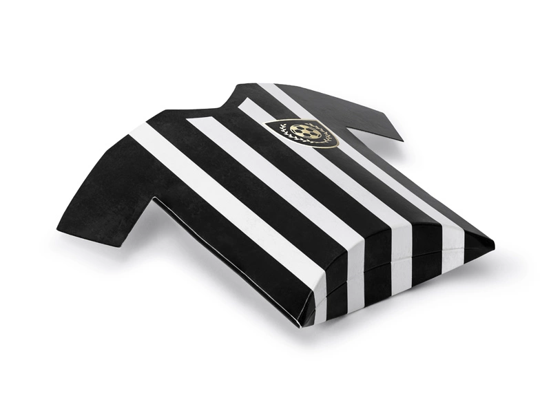 - Pudełeczka Koszulki piłkarskie w kolorze białym z czarnym i złotym metalizowanym nadrukiem, wymiary po złożeniu ok. 12 x 11 x 2.5 cm. (1 op. / 6 szt.)