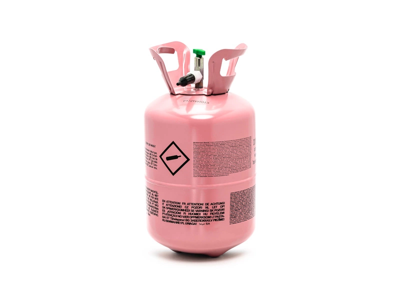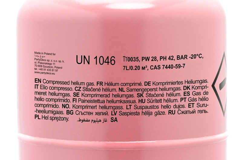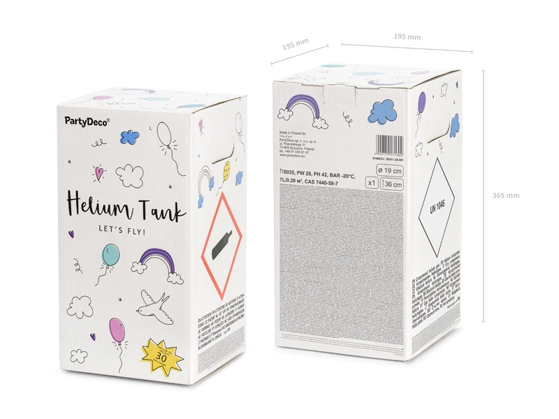 - Butla z helem na 30 szt. balonów w kolorze różowym z czarnym nadrukiem, pojemność ok. 0.20 m3.