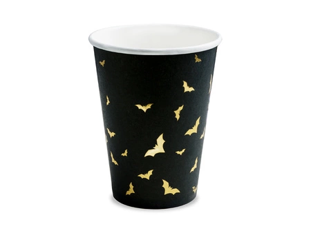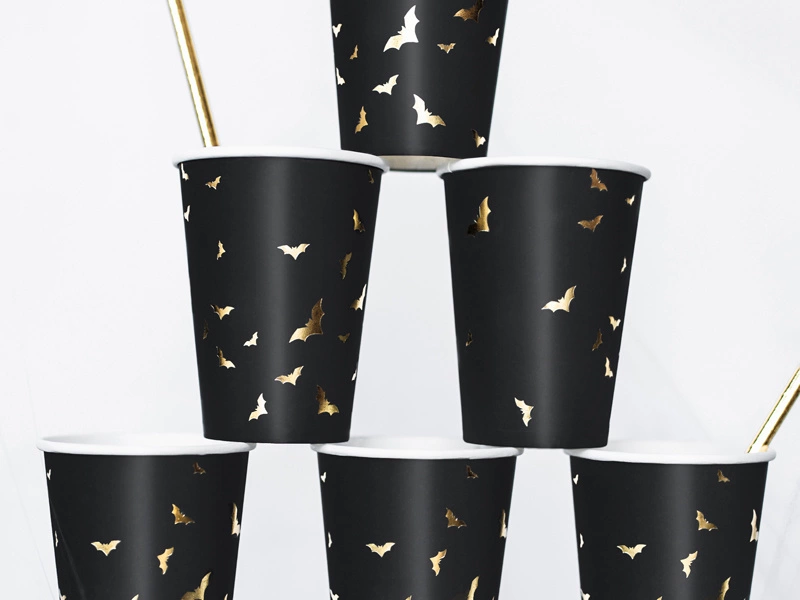 - Kubeczki papierowe Trick or Treat w kolorze czarnym ze złotym wzorem, pojemność ok. 220 ml. Kubki na napoje zawierają oznaczenia wymagane przez Rozporządzenie wykonawcze Komisji (UE) 2020/2151 z dnia 17 grudnia 2020 r. ustanawiające zasady dotyczące zharm