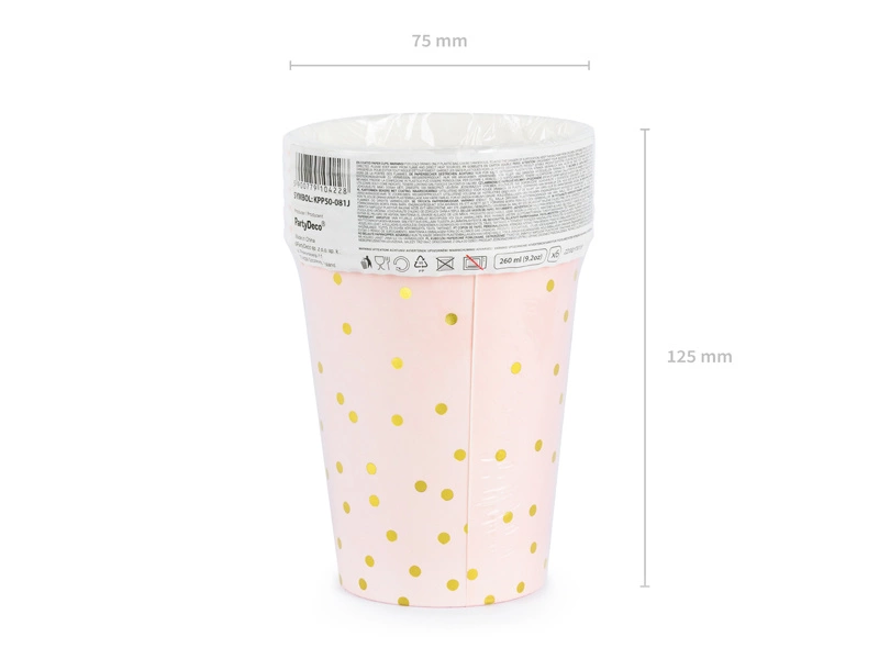 - Kubeczki papierowe w kolorze jasnoróżowym ze złotym wzorem kropek, pojemność ok. 260 ml. Kubki na napoje zawierają oznaczenia wymagane przez Rozporządzenie wykonawcze Komisji (UE) 2020/2151 z dnia 17 grudnia 2020 r. ustanawiające zasady dotyczące zharmoni