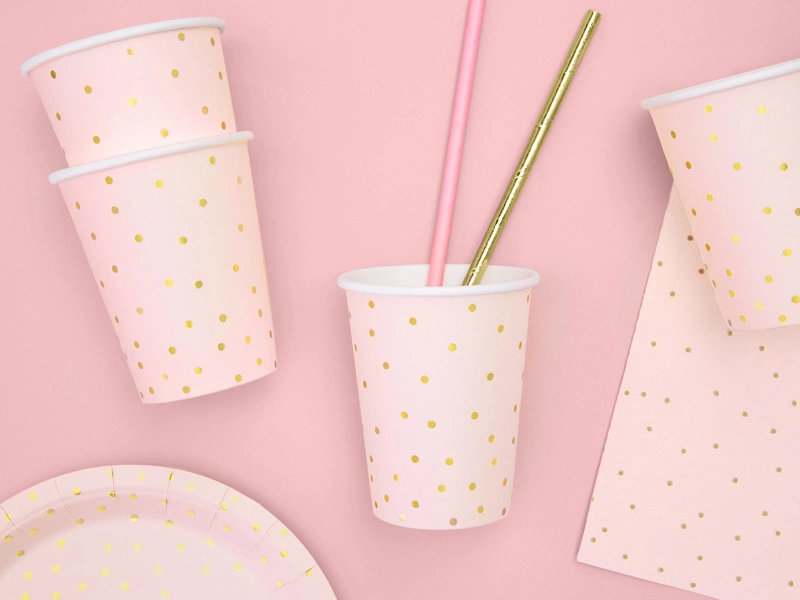 Zapraszamy do zakupu naszych jasnoróżowych kubeczków w złote kropki, które z pewnością dodadzą blasku każdej imprezie!