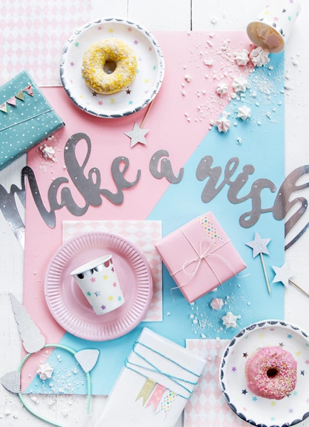 - Aby dodać jeszcze więcej magii, skomponuj kubeczki z innymi dekoracjami z motywem jednorożca, takimi jak talerzyki, serwetki i balony.