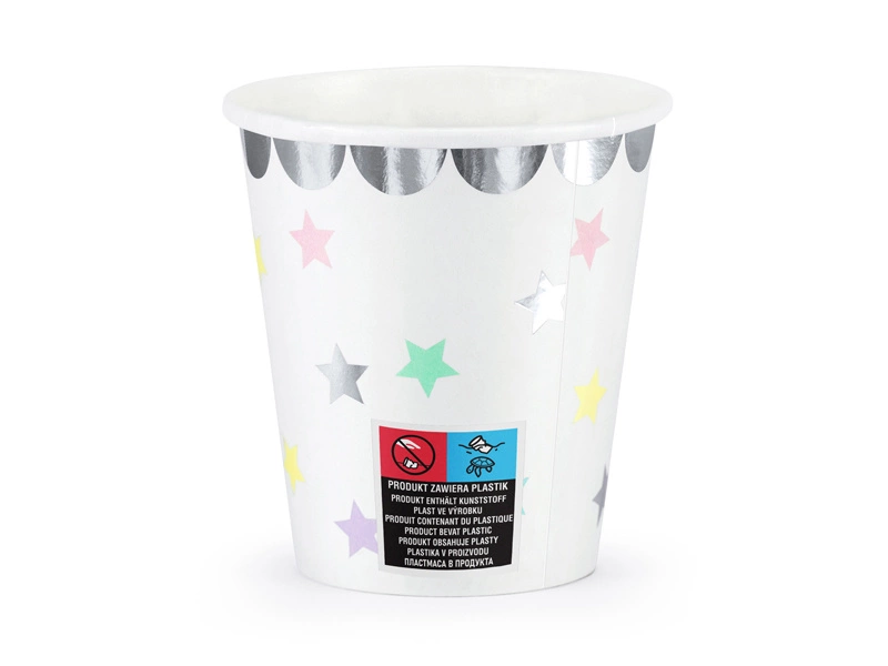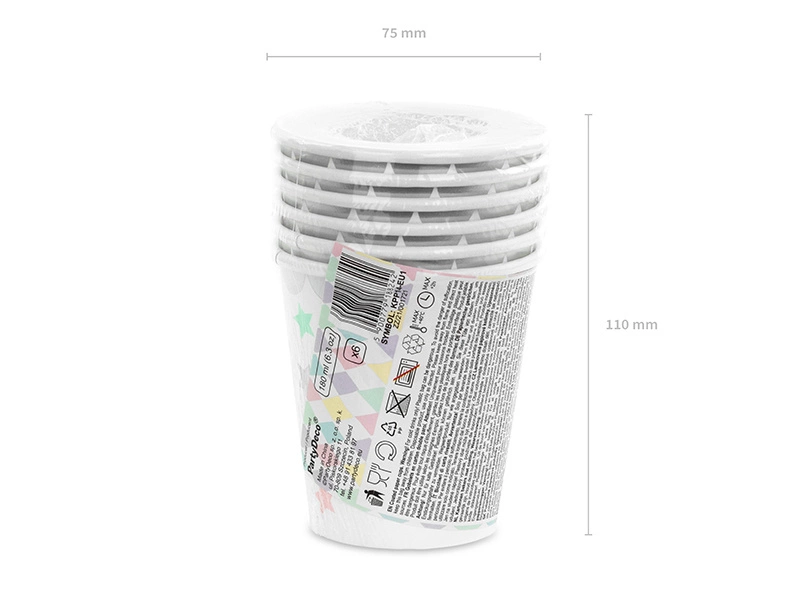 - Kubeczki papierowe Jednorożec - Gwiazdki, pojemność ok. 180 ml. Kubki na napoje zawierają oznaczenia wymagane przez Rozporządzenie wykonawcze Komisji (UE) 2020/2151 z dnia 17 grudnia 2020 r. ustanawiające zasady dotyczące zharmonizowanych specyfikacji w o
