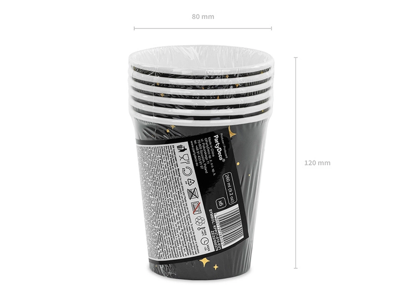 - Kubeczki papierowe w kolorze czarnym ze złotym wzorem, pojemność ok. 260 ml. Kubki na napoje zawierają oznaczenia wymagane przez Rozporządzenie wykonawcze Komisji (UE) 2020/2151 z dnia 17 grudnia 2020 r. ustanawiające zasady dotyczące zharmonizowanych spe
