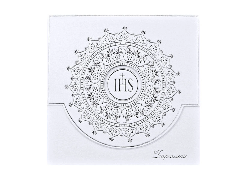 - Zaproszenia komunijne w kolorze białym ze srebrnym ornamentem, w zestawie z kopertami. (1 op. / 10 szt.)