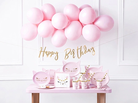 - Zestaw dekoracji party - Kotek, zestaw zawiera: baner Happy Birthday (1 szt.), kubeczki papierowe (6 szt.), talerzyki papierowe (6 szt.), słomki papierowe (10 szt.), serwetki papierowe (20 szt.) i balony lateksowe (blady róż, 12 szt.). Kubki na napoje zaw