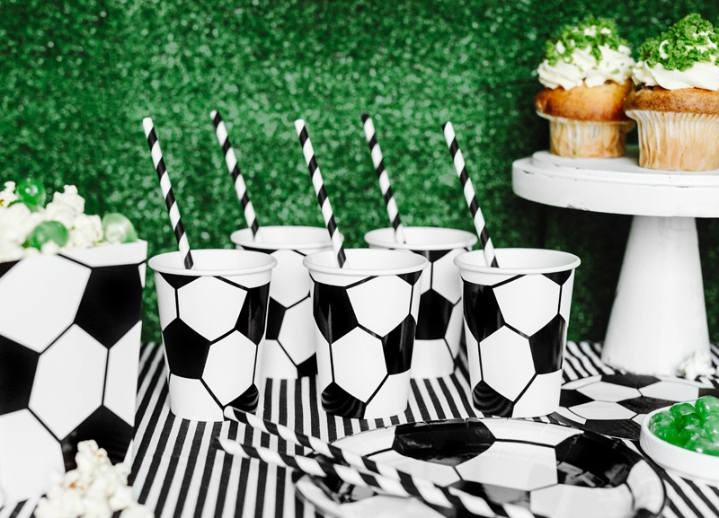 - Zestaw dekoracji party - Piłka, zestaw zawiera: kubeczki papierowe (6 szt.), talerzyki papierowe (6 szt.), pudełka na popcorn (6 szt.), serwetki papierowe (20 szt.), słomki papierowe (10 szt.) i balony lateskowe (Pastel Pure White 3 szt., Pastel Emerald G