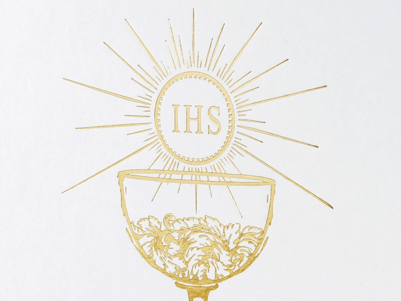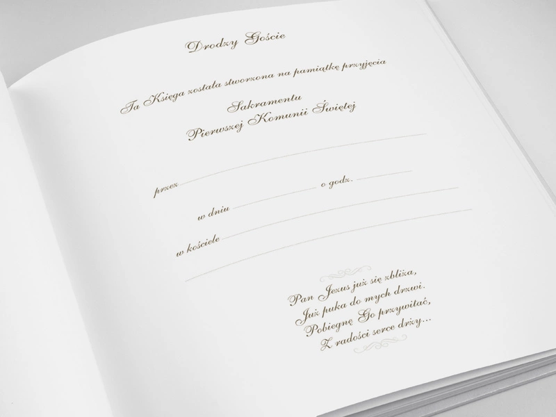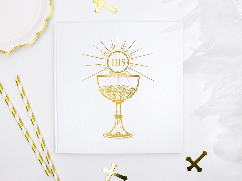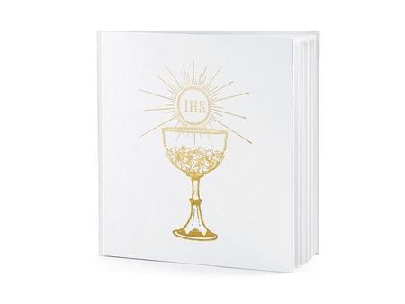 - Księga Gości Komunijnych oprawiona perłowym papierem w kolorze białym, ze złotym kielichem, 20,5x20,5 cm, 22 kartki. Posiada dwie pierwsze strony nadrukowane (do wpisania danych i wklejenia zdjęcia).