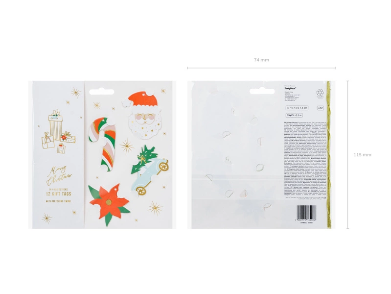 - Zawieszki do prezentów Mikołaj wykonane z papieru, mix wzorów i kolorów. Zestaw zawiera 12 zawieszek (4 wzory, po 3 szt. z każdego wzoru) i 2.5 m złotego sznurka. Wymiary zawieszek ok. 4-7 x 5-7.5 cm. (1 op. / 12 szt.)