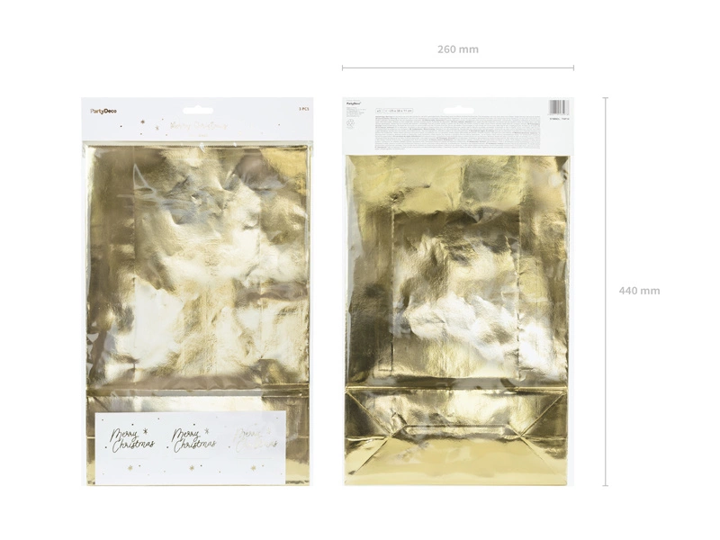 - Torebki na prezenty w kolorze złotym metalizowanym, zestaw zawiera 3 torebki i 3 naklejki, wymiary po złożeniu ok. 25 x 38 x 11 cm. (1 op. / 3 szt.)