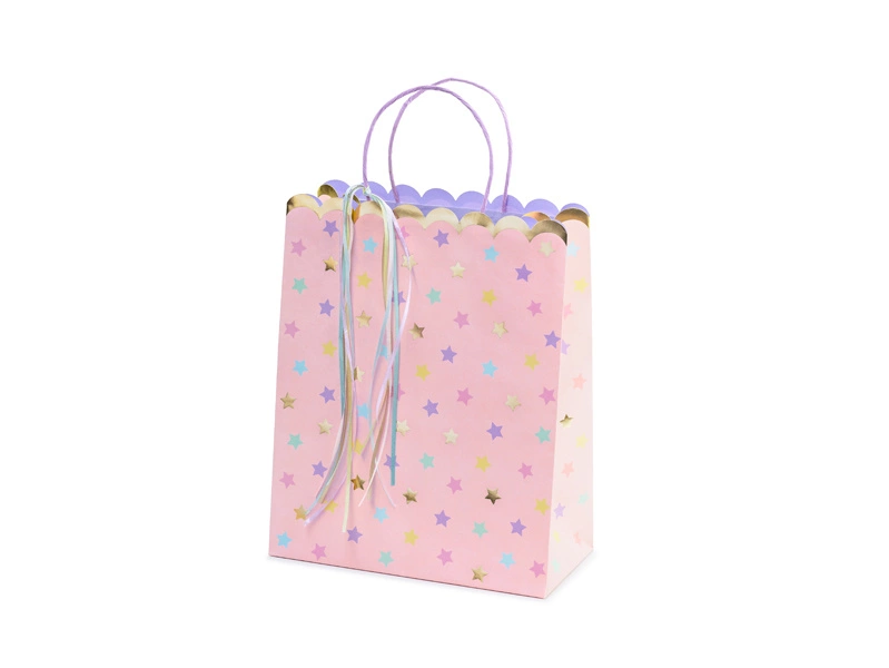 Kolor: Różowy z kolorowym i złotym metalizowanym nadrukiem, fioletowy nadruk wewnątrz Rozmiar: 26 x 32 x 13 cm Materiał: Papier wysokiej jakości