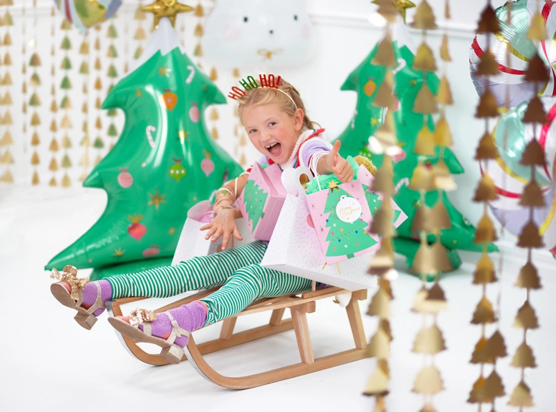 - Torebka na prezenty Choinka w kolorze jasnym różowym z kolorowym i złotym metalizowanym nadrukiem, wymiary bez uchwytów ok. 14 x 20.5 x 8 cm.