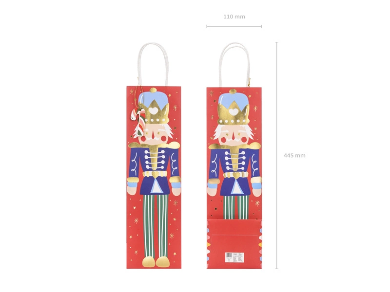 Wprowadź odrobinę magii do swoich prezentów z torebką na prezenty Dziadek do orzechów! Ta stylowa torebka w głębokim czerwonym kolorze, ozdobiona kolorowym i złotym metalizowanym nadrukiem, doda wyjątkowego uroku każdemu upominkowi. Doskonała na różne okazje, od świąt Bożego Narodzenia po urodziny.