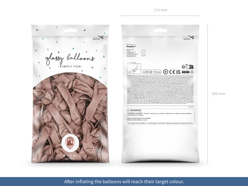 Wprowadź odrobinę luksusu i blasku na swoją imprezę dzięki balonom Glossy w odcieniu różowego złota! Te eleganckie balony o średnicy 12 cm stanowią doskonały dodatek na różnorodne okazje, od wesel i wieczorów panieńskich po urodziny, baby shower, Boże Narodzenie i Walentynki. W jednym opakowaniu znajdziesz 50 sztuk, co umożliwia stworzenie imponujących dekoracji.