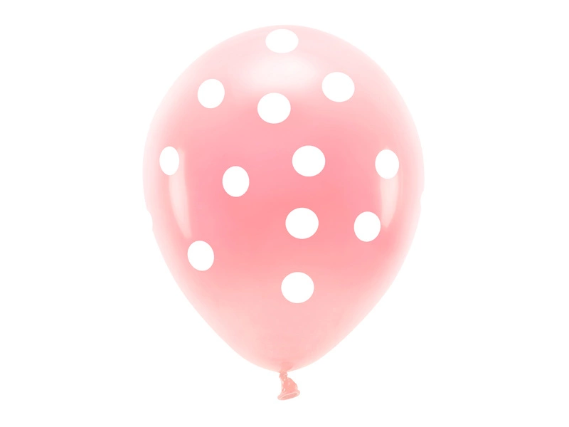 - Balony Eco Kropki, pastelowe w kolorze jasnoróżowym z pięciostronnym nadrukiem w kolorze białym, średnica ok. 33 cm. (1 op. / 6 szt.)