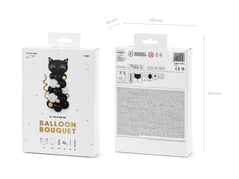 - Bukiet balonów Kotek w kolorze czarnym, zestaw zawiera: balony lateksowe (33 szt.), balony modeliny (2 szt.), balon foliowy (1 szt.), słomkę papierową (1 szt.), taśmę piankową (24 szt.) i 2.5 m taśmy do girland. Wymiary ok. 83 x 140 cm.