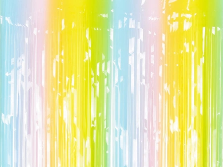 - Kurtyna Party mocowana na taśmę dwustronną przyczepioną do kurtyny, mix kolorów: jasny zielony, żółty, pomarańczowy, jasny różowy, liliowy, jasny niebieski, szerokość ok. 100 cm, długość ok. 195 cm.