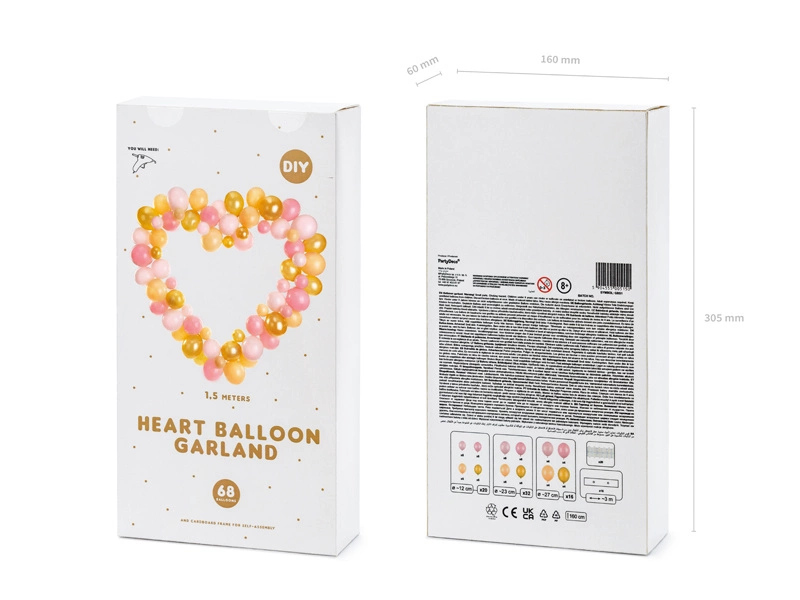 - Różowa girlanda balonowa ze stelażem Serce, zestaw zawiera 68 balonów lateksowych (17 szt. w kolorze Pastel Pale Pink, 17 szt. w kolorze Pastel Baby Pink, 17 szt. w kolorze Pastel Light Peach, 17 szt. w kolorze Metallic Gold), 16 kartonowych elementów, 20