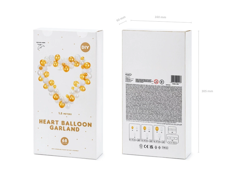 - Biało-złota girlanda balonowa ze stelażem Serce, zestaw zawiera 68 balonów lateksowych (22 szt. w kolorze Pastel Pure White, 23 szt. w kolorze Metalic Pure White, 23 szt. w kolorze Metallic Gold), 16 kartonowych elementów, 20 szt. naklejek dwustronnych, i