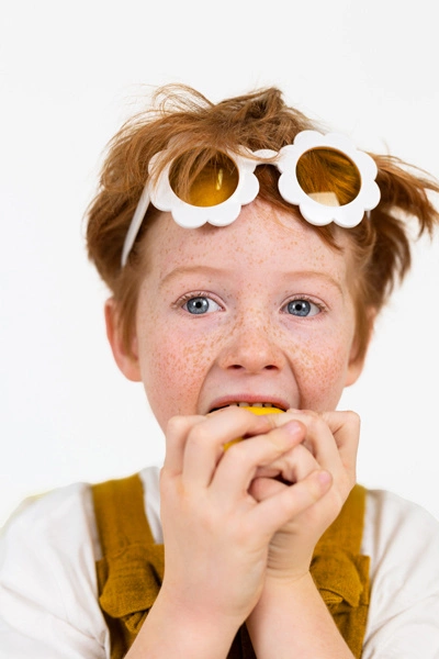 - Okulary Stokrotki w kolorze białym z soczewkami w kolorze żółtym, wymiary: szerokość oprawki ok. 13 cm, wysokość oprawki ok. 6 cm, długość zausznika ok. 13 cm.