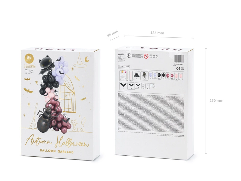 - Girlanda balonowa Halloween, mix kolorów, zestaw zawiera: balony lateksowe (88 szt.), balony modeliny (3 szt.), balony foliowe (7 szt.), papierowe nietoperze (7 szt.), taśmę piankową (20 szt.), słomkę papierową, 5 m taśmy do girland, Wymiary ok. 210 x 120