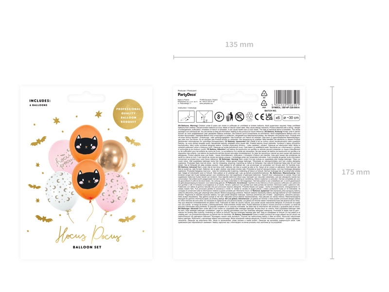- Balony Strong Hocus Pocus z nadrukami, zestaw zawiera 6 balonów (2 pastelowe w kolorze pomarańczowym z nadrukiem, 1 biały z nadrukiem, 2 pastelowe w kolorze Soft Pink z nadrukiem, 1 Glossy w kolorze złotym) średnica ok. 30 cm. (1 op. / 6 szt.)