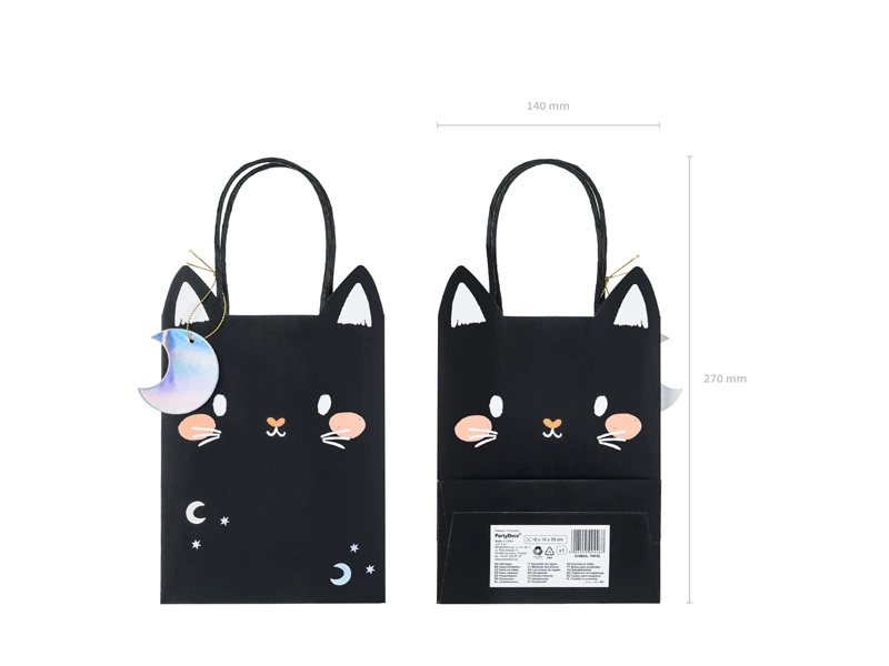- Torebka na prezenty Kot w kolorze czarnym z kolorowym nadrukiem i zawieszka w kształcie księżyca, wymiary bez uchwytów ok. 8 x 14 x 18 cm.