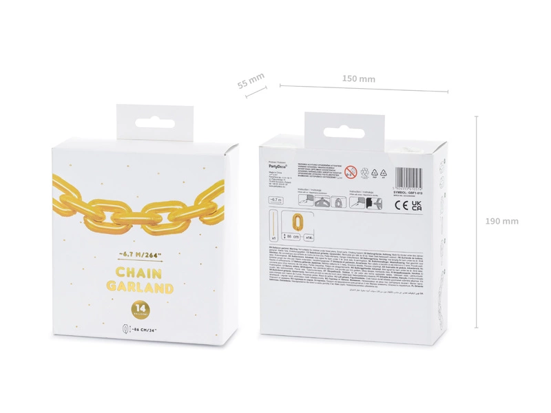 - Girlanda balonowa Łańcuch w kolorze złotym, wymiar jednego ogniwa ok. 86 cm (34''), wymiary napompowanej girlandy ok. 6,7 m (264"). Zestaw zawiera 14 balonów foliowych oraz słomkę. Do samodzielnego złożenia. (1 op. / 14 szt.)