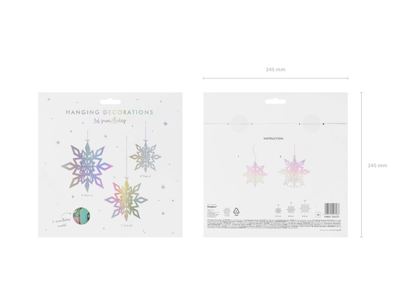 - Zawieszki dekoracyjne Śnieżynki wykonane z papieru. Zestaw zaiwera 6 zawieszek (po 2 z każdego rozmiaru), średnice ok. 15 cm, 20 cm, 25 cm. (1 op. / 6 szt.)