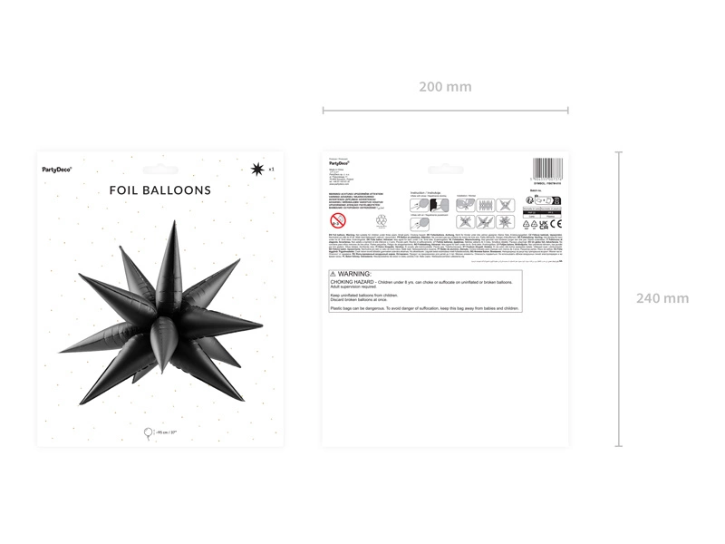 - Matowy balon foliowy Gwiazda 3D w kolorze czarnym, średnica ok. 95 cm (37.5''). Zestaw zawiera słomkę.