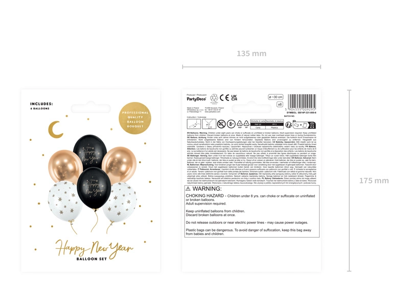 - Zestaw zawiera 6 balonów: 2 białe z nadrukiem, 2 czarne z nadrukiem, 2 metalizowane złote.