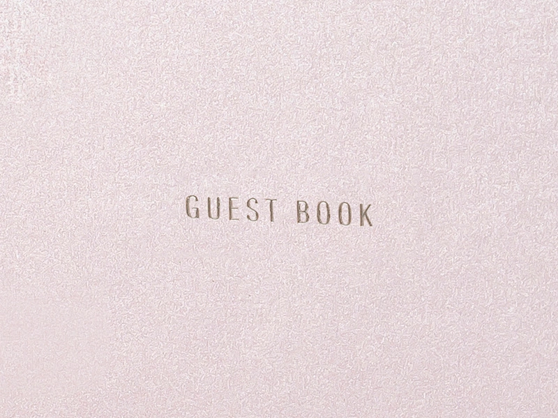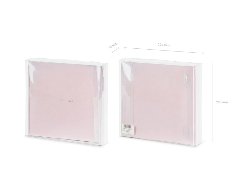 - Księga Gości oprawiona perłowym papierem w kolorze pudrowego różu z platynowym napisem "Guest Book", wymiary 20,5x20,5 centymetra, 60 kartek.