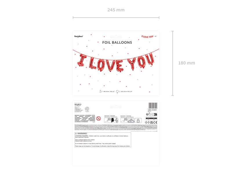 - Balon foliowy napis I Love You metalizowany w kolorze czerwonym, wymiary przed napompowaniem ok. 260 x 40 cm (102 x 16''), wymiary po napompowaniu ok. 210 x 35 cm (82,5 x 14''). Do napompowania powietrzem. Zestaw zawiera słomkę oraz wstążkę o długości ok.