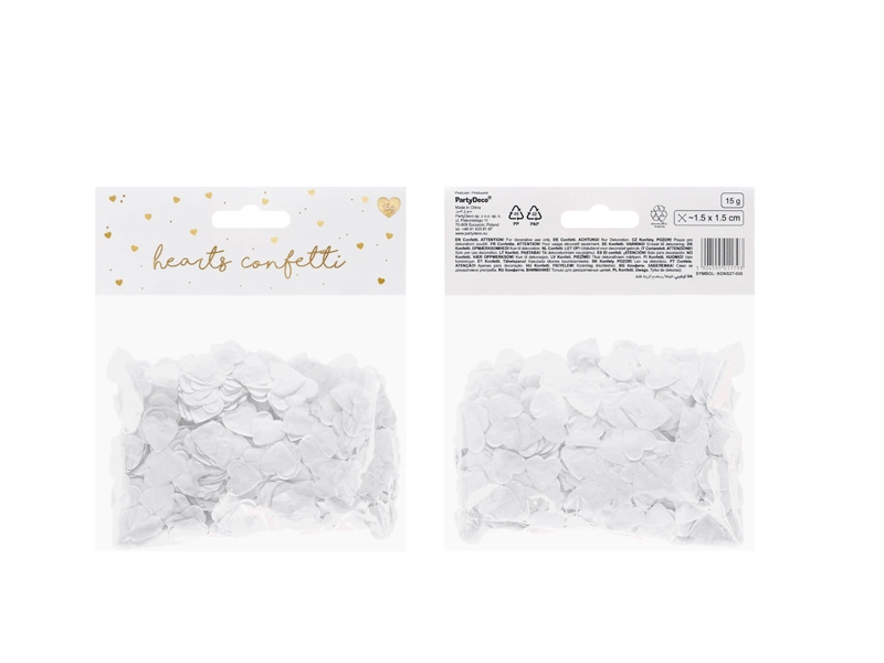 - Bibułowe konfetti Serca w kolorze białym wymiary ok. 1,6 x 1,6 cm, opakowanie zawiera ok. 15 g produktu.