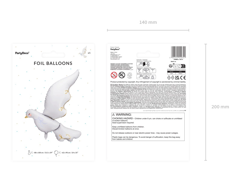 - Balon foliowy Gołąb, mix kolorów, wymiary przed napompowaniem ok. 80 x 100 cm (31.5 x 39''), wymiary po napompowaniu ok. 62 x 90 (24 x 35''). Do napompowania powietrzem i helem. Zestaw zawiera słomkę.