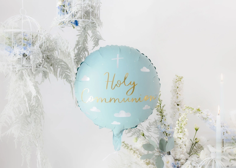 - Balon foliowy z napisem ''Holy Communion'', mix kolorów, wymiary przed napompowaniem ok. 45 cm (18''), wymiary po napompowaniue ok. 35 cm (14''). Do napompowania powietrzem i helem. Zestaw zawiera słomkę.