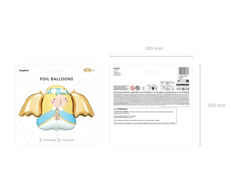 - Balon foliowy Aniołek, mix kolorów, wymiary przed napompowaniem ok. 103 x 58 cm (40.5 x 23''), wymiary po napompowaniu ok. 77 x 45 cm (30 x 18''). Do napompowania powietrzem i helem. Zestaw zawiera słomkę.