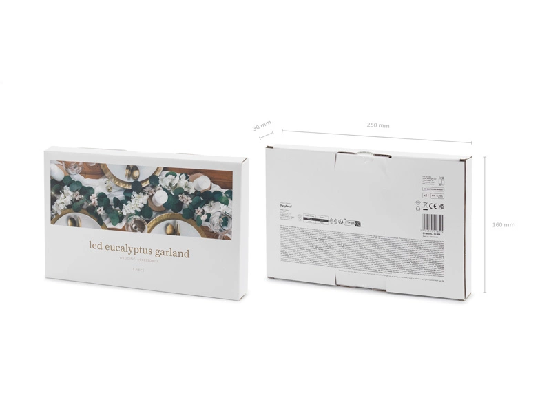 - Girlanda Eukaliptus w kolorze zielonym z 20 lampkami LED o ciepłej barwie światła, długość ok. 2 m. Przeznaczone do użytku wewnętrznego, zasilane bateriami 2 x AA (nie dołączone). Brak możliwości łączenia z innym zestawem oświetleniowym. Napięcie znamiono